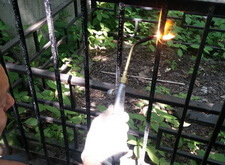 Мы заварили прутья, укрепили заднюю часть ограды и приступили к покраске. Начали процесс с зачистки ограды, а если быть точнее то с обжига старой краски. На некоторых фотографиях вы можете видеть как мы это делаем.